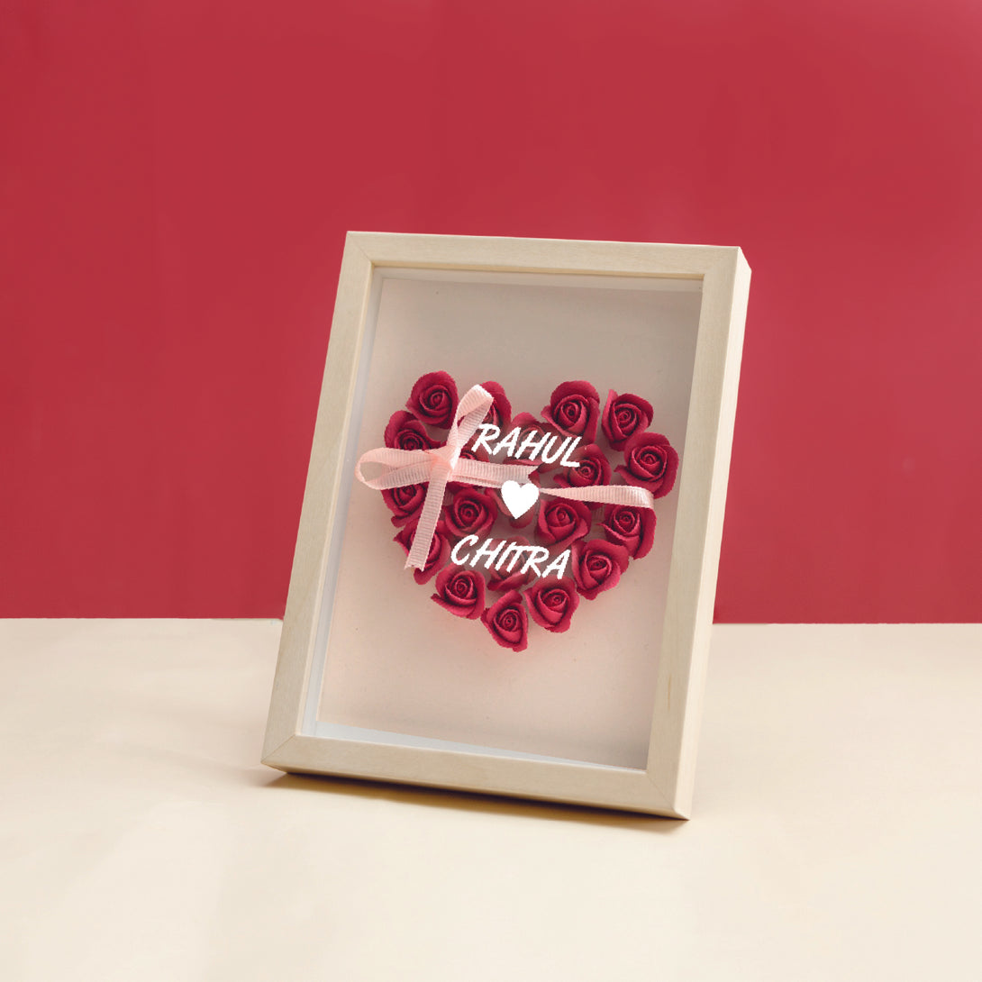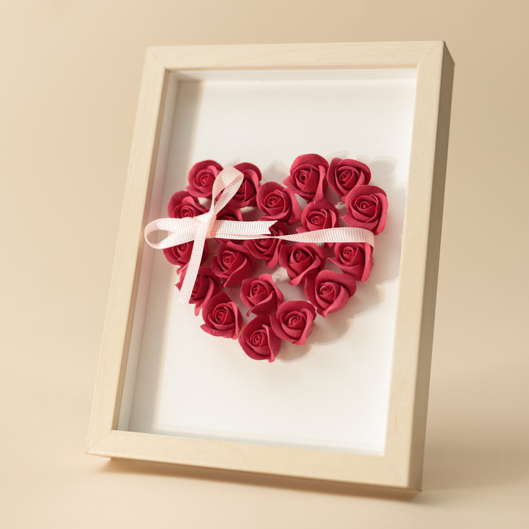 A frame that is all you that you need. Portraying all your love and heart for your loved one. Elegant and romantic, this handcrafted frame features a cluster of delicate clay roses arranged in a stunning heart shape. It’s the perfect way to express your love and appreciation this season, blending artistry with timeless charm.