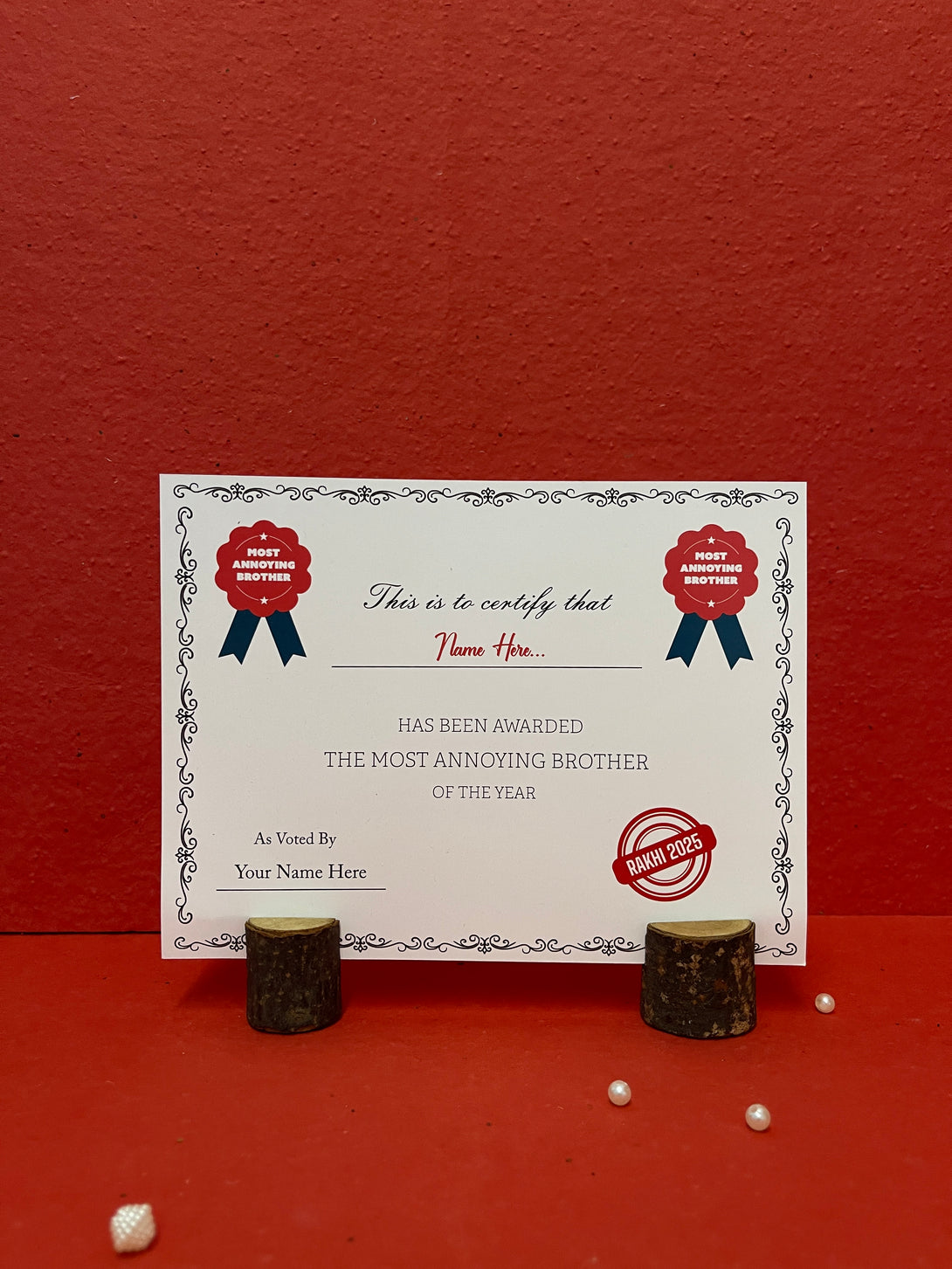 Because no Rakhi is complete without some light-hearted revenge. This “Most Annoying Brother” certificate is the ultimate sibling roast — officially signed, sealed, and (unfortunately for him) framed forever. Add his name and yours, and you’ve got the pettiest gift of the season.