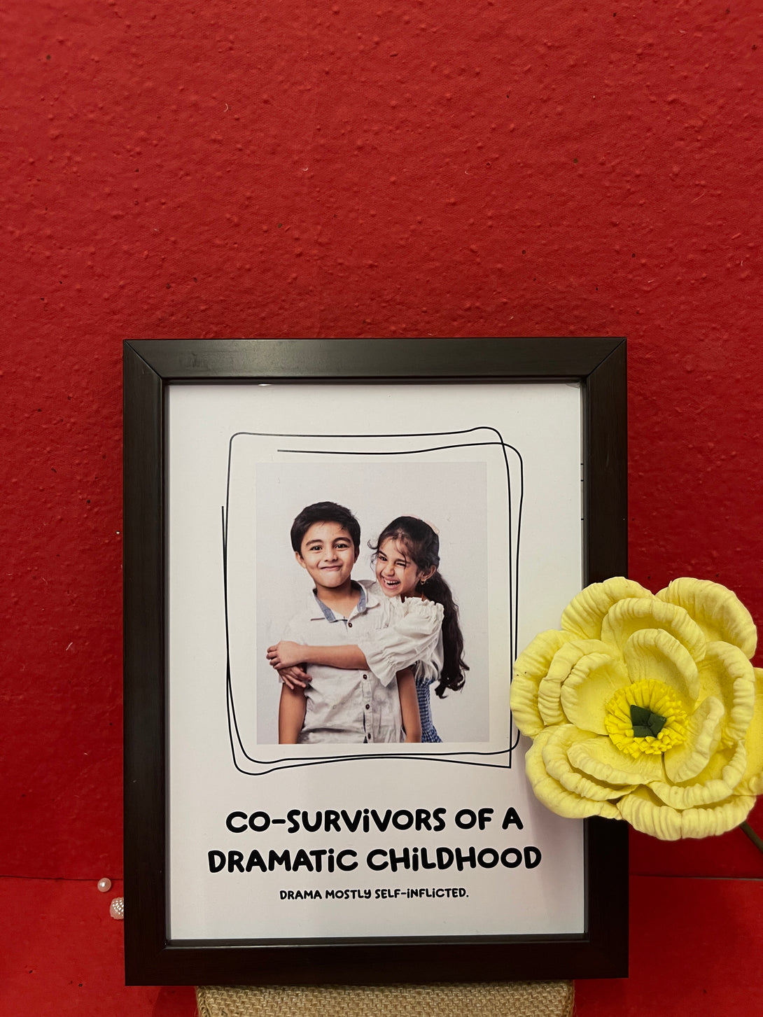 From stealing toys to surviving family functions — this frame is for those who made it out (somewhat) emotionally stable. A reminder that growing up chaotic was way more fun with them by your side