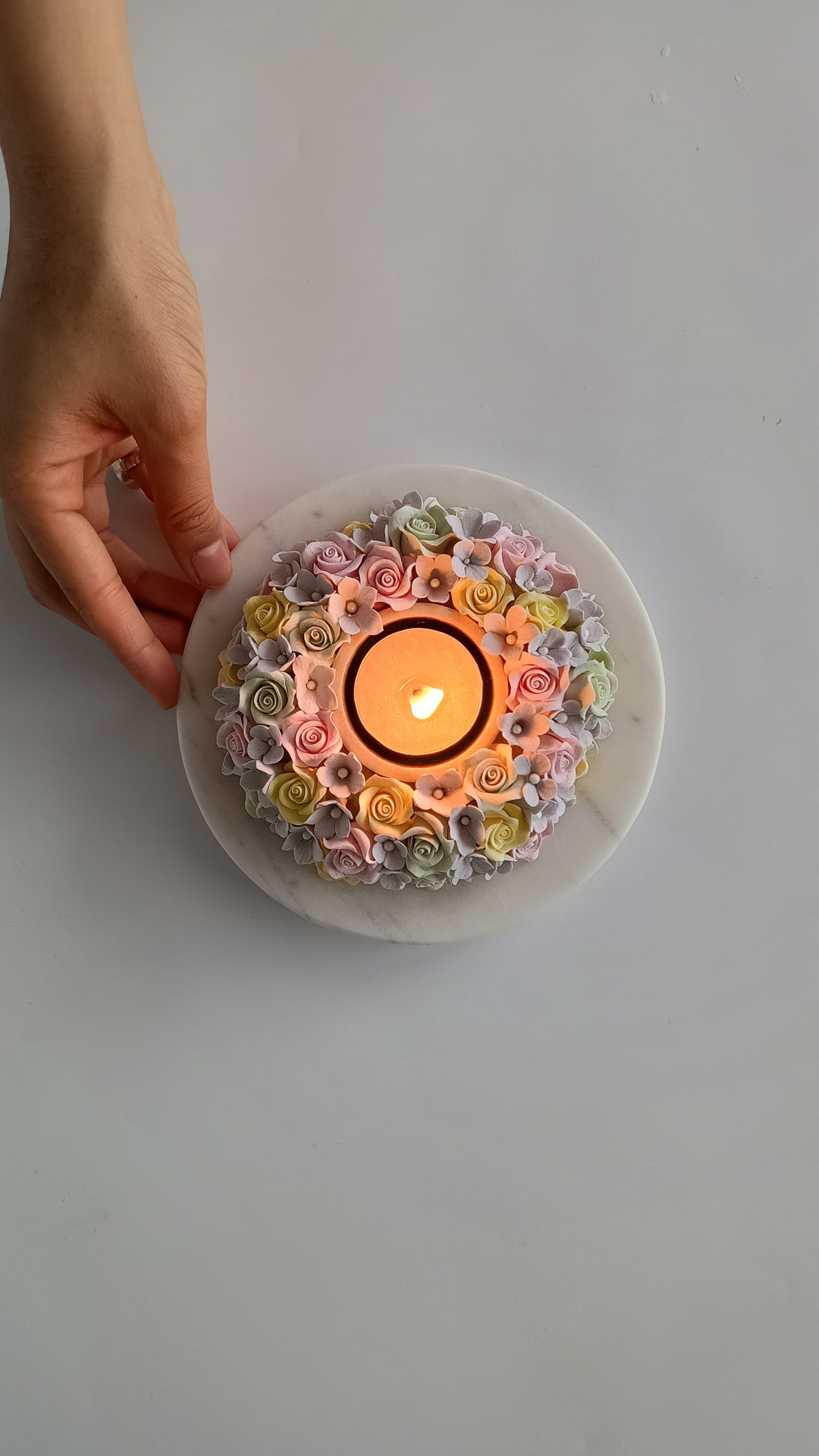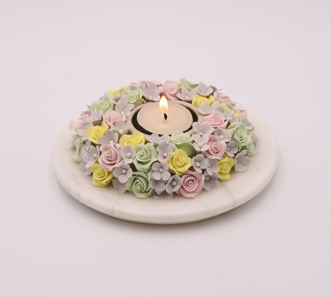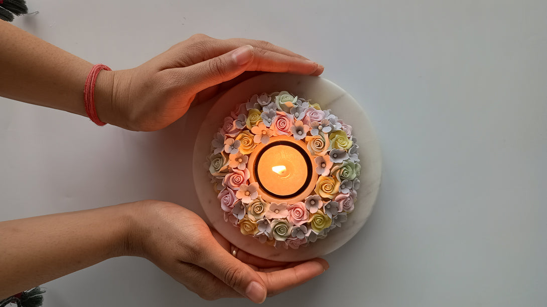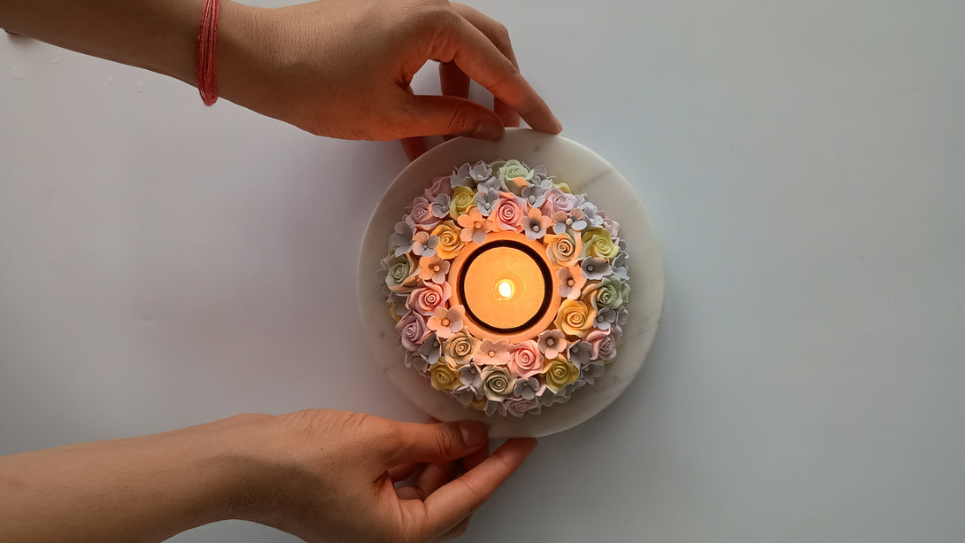 Illuminate your space with our exquisite handcrafted clay floral diyas, meticulously crafted by skilled artisans using eco-friendly deco clay. These vibrant flowers, set on a polished marble base, radiate beauty and charm. Simply place a tea light in the centre to witness a mesmerising play of colors that brings warmth and elegance to any setting.